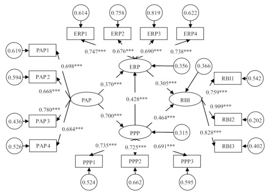 Second, to ensure the rationality of the questionnaire structure, the formal questionnaire was formed under an expert review, with a questionnaire pre-test and questionnaire revision. We conducted a pre-test to test the reliability and validity with the help of the Beijing Modern Manufacturing Industry Development and Research Institute and the China Scientific Association Strategy Institute, with 50 questionnaires, of which 47 were valid. High–low difference tests were conducted on all the items (the figures 27% and 73% were used as the high–low grouping critical points), and the grouping difference of all items was significant (with p-values of less than 0.05 and t-values greater than 1.96). Additionally, the results of factor analysis verified the overall reliability of the questionnaire, as the Cronbach’s alpha of each scale (PAP, PPP, ERP, RBI) was 0.787, 0.905, 0.874, and 0.748, respectively, meaning that the scale had good reliability; at the same time, factor analysis showed that the factor load of each item was above 0.6, indicating that all latent variables were accepted.