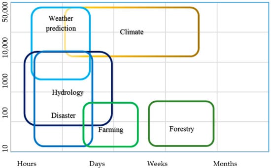 Summary of spatial (m) and temporal resolution required for soil moisture application in different fields adopted from [15].