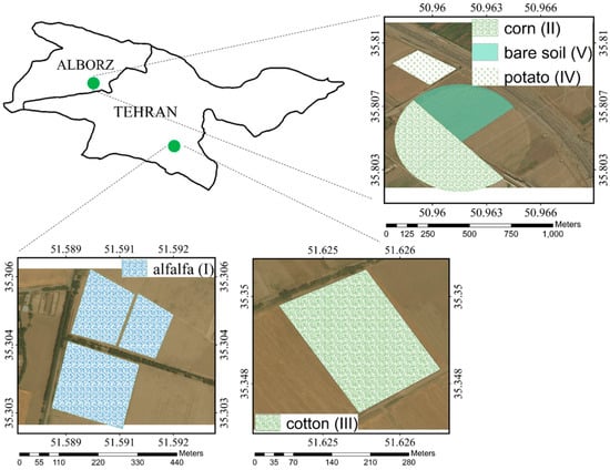 The study area consists of five farms located in Tehran and Alborz provinces in Iran. The total area of agricultural land is about 54 acres. Tehran farms use drip irrigation, while Alborz farms are equipped with a center pivot and sprinkler irrigation system. Figure 2 shows the location of the farms and the crop types.