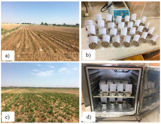 For ground sampling, agricultural fields were classified according to their crop type. Sampling was performed when the plants were in the early stages of growth (NDVI < 0.2), so the surface was not covered with plants. After the soil surface was cleaned, the samples were taken from a depth of about 10 cm. In total, 170 samples (110 samples for multispectral images and 60 samples for SAR images) were taken. The samples’ gravimetric soil moisture content was obtained using the drying process in the laboratory depicted in Figure 4. By measuring the soil density, the volumetric soil moisture was also calculated. The calculated moisture represented the average SSM of the corresponding pixel.