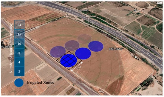 Consequently, different SSM zones were created at the time of satellite overpass, as shown in Figure 6. Since each sprinkler can water a circle with a radius of 15 m, each zone consists of nine Sentinel-2 pixels that are entirely or partially bounded by the sprinkler circle (Figure 6). Therefore, due to the conditions, the results show how surface reflectance is affected by SSM.