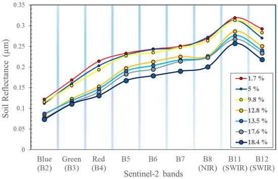 The soil surface reflectance captured by Sentinel-2 is highly dependent on SSM, as depicted in Figure 7. Indeed, when SSM increases, the soil color darkens and the soil reflectance decreases [44]. Although reflectance in all the Sentinel-2 bands decreases with increasing soil moisture, the visible bands B2 (blue), B3 (green), and B4 (red) have the highest negative correlation with the SSM (R < −0.76). However, previous studies showed that the longer wavelengths are more sensitive to the SSM variation if it increases more than 0.2 [29]. Since, in irrigation events, the SSM is almost about 0.2 due to drainage and evapotranspiration processes, Sentinel-2 bands are a good choice for SSM estimation. Moreover, it is possible to monitor soil moisture at high resolution using multispectral cameras mounted on drones or UAVs over agricultural fields [45].