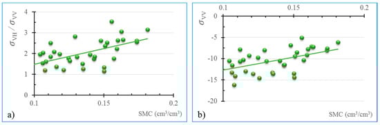 An increase in the SSM increases horizontal and vertical backscatter. (a) Backscatter ratio of horizontal to vertical () polarization. (b) Vertical polarization ().