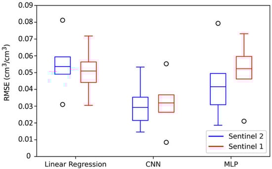Three machine learning algorithms, including multilayer perceptron (MLP), convolutional neural network (CNN), and linear regression, were used to estimate SSM from Sentinel-1 and Sentinel-2 retrieval. Studies showed that MLP has the ability to solve a complex problem such as fitness approximation [43]. The CNN algorithm is similar to MLP, except that it can recognize spatial relations by taking a tensor instead of a vector as the input. Linear regression is a supervised learning algorithm that predicts a dependent variable value based on some given independent variables. These algorithms were used to create a relationship between features and targets. Each algorithm used 80% of the data for training and 20% for validating the model performance (training and validating data were selected randomly). For validating the model, the estimated SSM was compared with ground measurements. This process was repeated 100 times, and the RMSEs were reported. Since CNN has the best performance among other algorithms, it is applied to estimate SSM in optical and radar images.