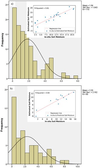 Soil moisture was retrieved by the proposed method as a function of soil moisture measured in the reference fields. (a) Soil moisture retrieved by multispectral images of Sentinel-2; the mean RMSE is and model error distribution. (b) Soil moisture retrieved by radar images of Sentinel-1; the mean RMSE is and model error distribution of radar images.