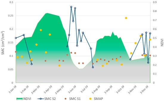 Soil moisture content (SMC) is an essential factor in exchanging water, biogeochemical, and heat fluxes between the earth and its surrounding atmosphere [1,2,3]. The generation of surface runoff and the rate of water infiltration in the soil are also controlled by surface moisture [4]. Moreover, the SMC variation is vital for precision farming applications since soil water storage influences the irrigation scheduling and fertilizer rate in low rainfall climates [5,6], especially for areas facing water scarcity [7,8,9]. In the past, before the advent of remote sensing techniques, ground-based soil moisture sampling was the only solution to measure soil moisture and observe its changes. Further, the soil moisture networks were established for measuring the SSM [10].