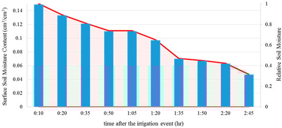 Since there is a spatial mismatch between the SMAP-Sentinel1 (1 km) and Sentinel 1 and 2 (10 m) SSM products, and the machine learning algorithm only trained over the case study plots, we choose to compare the SMAP-Sentinel1 with SSM-S1 and SSM-S2 temporally rather than spatially according to Figure 11. As illustrated in this figure, the SSM-S1 is in better agreement with the SMAP-Sentinel1 relative to the SSM-S2. The SMAP-Sentinel1 uses an L-band radiometer, which is less affected by the dense vegetation compared to the Sentinel-1 radar that operates in the C band. This explains the significant difference in SSM estimation (March to May) by Sentinel-1 and SMAP-Sentinel1. The SSM-S2 model is susceptible to surface coverage, especially after the plant’s germination. Thus, when the NDVI is greater than 0.2, this algorithm could not work properly, and we masked the data. The acquisition time of Sentinel-2 is about 11:16 a.m, but the acquisition time of Sentinel-1 is about 5:37 p.m. According to the study mentioned in the introduction section ([49]), although the soil moisture from a rain event can be observed up to 3 days after rainfall, the situation is different in irrigation events. The rate and the time of irrigating are less than the rainfall. Runoff and puddling are rarely observed in irrigating, so the root zone layer is less likely to be saturated. Moreover, on rainy days, the weather is mostly cloudy and the temperature is low. So the evaporation rate after rainfall is much lower than the evaporation rate after an irrigation event. In our region, due to percolation and evapotranspiration processes, the surface soil moisture becomes dry entirely in less than 24 h. We examined this using a sprinkler that irrigated a part of the land for about one hour. After that, the soil moisture was measured at a specific point near the sprinkler every 15 min. As Figure 12 shows, The SSM began to decrease after irrigation stopped and after about 3 h, it lost about 70% of its moisture. Therefore, as most of the irrigation occurred in the morning and the soil begins to dry out in the evening, the SSM-S2 shows an entirely different time series from the SSM derived from Sentinel-1 or SMAP.