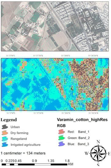 SSM-S1 and SSM-S2 are used to detect the irrigated area using unsupervised classification. As illustrated in Figure 13, farms are detected in irrigated agriculture and dry farming classes; moreover, the city area is recognized as well. To better understand this classification, an aerial true-color image of the same place and the same time is derived from google earth images depicted beside the classification. The overall accuracy is 77% the kappa coefficient is 65%, and the commission error for detecting irrigated agriculture is 56%.