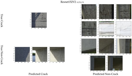 Examples of true positive (TP), true negative (TN), false positive (FP), and false negative (FN) images for Resnet50 10,580,322 and Resnet152V2 10,574,178 models are shown in Figure 8 (for the rest of CNN models in this study see Appendix D). As can be seen, Resnet152V2 incorrectly predicted six crack images as non-crack images while Resnet50 correctly identified five of them as a crack and was only unable to identify one of the crack images as it included edges and dark and light backgrounds; these kinds of images cannot be handled by most of the CNN models. Moreover, it seems that Resnet152V2 identifies shadows as cracks, as it incorrectly identified three images with shadows as crack images while they are non-crack elements, while Resnet50 identified two of them correctly. It also can be seen that Resnet50 incorrectly identified a 90° edge without shadows as a crack, but the existence of some lines in conjunction with some parts of the concrete might be the reason.