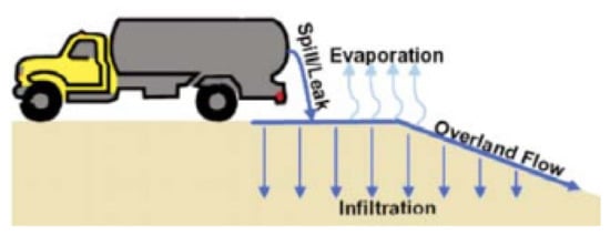 From the point of view of environmental sciences, it is necessary to address the impact of HL leakage and to propose measures to minimize the negative impact, especially biotic components of the environment. The research presented below focuses on the leakage of HL from the tank during its transport and its subsequent spreading (overland flow), infiltration, and evaporation into the environment near the place of leakage (Figure 1) [20].