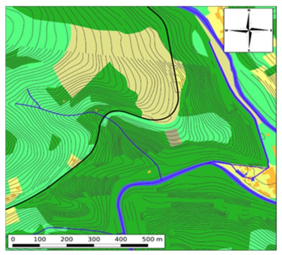Figure 4 contains a section of the map with contour lines. Figure 5 demonstrates the structure of the terrain as a network of objects. For the sake of clarification, roads are marked in black, and watercourses in blue. In the views of the terrain, the buildings are marked in red. The contour map is simplified, and the buildings are not shown in this case. The results of the application of the model and the performed computational analyses are further demonstrated in the article on the given reference example of the selected area.