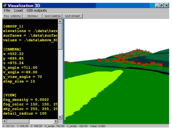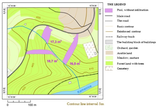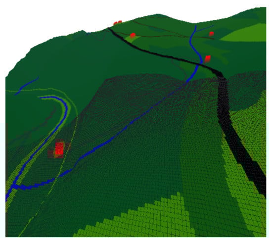 The identical procedure was followed in the topography. The types of surface objects to be displayed were specified (roads, watercourses, buildings, type of land cover-meadow, forest, arable land, and other areas). For each type, a specific group of physical properties that are needed to calculate the spread of fluid across the surface is defined. An example of building a terrain model is demonstrated in Figure 3, Figure 4 and Figure 5. Figure 3 depicts a section of a map of the selected area of interest in the ZABAGED environment.