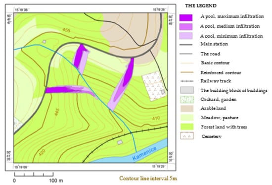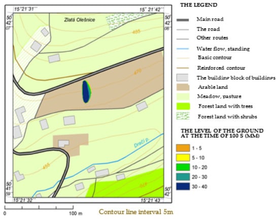 The terrain model describes a part of the earth’s surface in the vicinity of the considered HL leakage site. It is always represented by two files, one of them expresses elevation, and the other topographic data. Basic elevation data-contours and dimensioned points were adopted from the ZABAGED database. First, values were assigned to objects with elevation data from GIS. The altitudes for the other objects were then recalculated using interpolation methods.