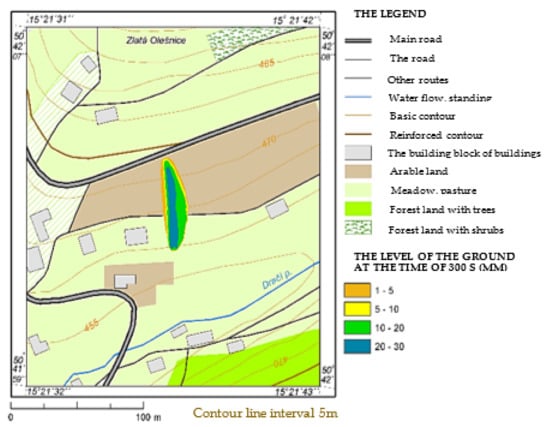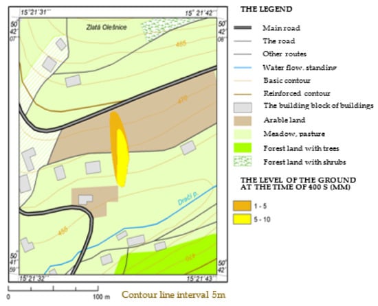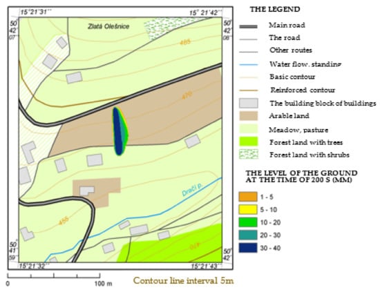 - Environment at the site of the event-necessary to describe the spread of fluid: The description of the medium contains an elevation and topographic model, which was improved several times. It was mainly an automated treatment of data discrepancies adopted from various map materials (e.g., the corner of the building located in the river). At the level of the required accuracy of calculations, this proved to be a significant problem;