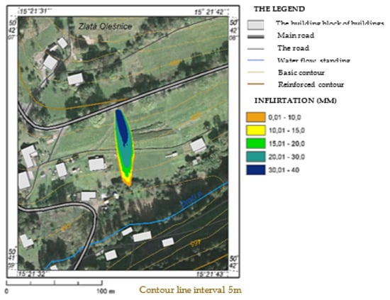 where f represents the volume of liquid infiltrated per unit time on the unit area (m/s), K is the hydraulic conductivity of the medium for the given liquid (m/s), P represents the ratio of the volume of unsaturated pores (–), ψ is the suction pressure height of the medium below the surface (m), and F is the volume so far infiltrated per unit area (m2). A more detailed description of the Green-Ampt model can be found in, e.g., [43].