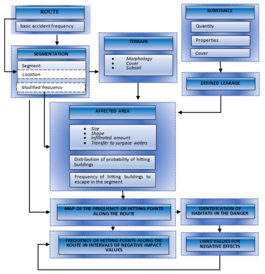 In terms of the article focus, the BIOTRA project, solved in 2008–2011 [33], was a valuable inspiration. Its main goal was to propose a procedure for assessing the impacts of the transport of dangerous goods on natural ecosystems and to create a support tool for selecting a transport alternative with a minimum environmental impact and predicting environmental damage to biotic components near the transport route.