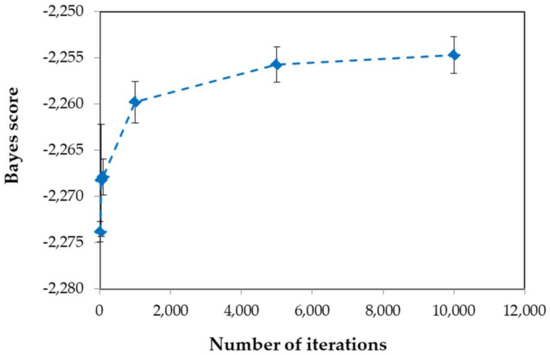 Bayes or K2 scores of the networks obtained for each number of iterations and for five different tests for use case 2 data. The error bars indicate the standard deviation.