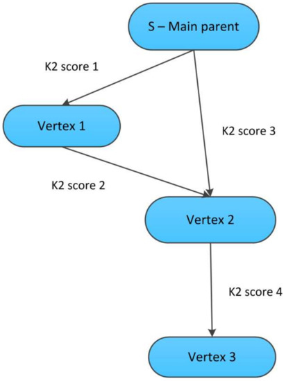 Graphical example of a graph with the K2 scores of each arrow connecting the different nodes (main parent and other vertexes).