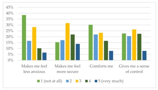Third, the results confirm that stocking food products provides customers with a feeling of control over the perilous situation generated by the actual health crisis. Indeed, 35.9% of the participants who stockpiled food indicated that this behavior makes them feel more secure, 24.5% indicated that it comforts them, and 30.5% indicated that it gives them a sense of control (all by including levels 4 and 5) (Figure 4). These results suggest that panic buying and stockpiling are behavioral responses to negative feelings and emotions such as stress, fear, and anxiety and a way for consumers to reclaim control over product procurement [40]. Indeed, stockpiling food provides consumers with a feeling of control [41].