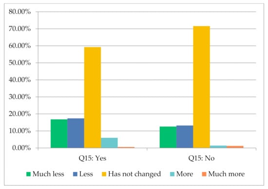 Further, the Chi-square test result shows a meaningful association between stockpiling food and food waste behavior (χ2 = 23.72, p < 0.01). Thus, stockpiling food did not increase food waste. In fact, for 34.61% of the respondents who stockpiled food, their waste became less compared to 25.8% for those who did not stock food (by including “It has become much less” and “much less” answer options) (Figure 5). These results are in agreement with those obtained by other scholars [17,59], who argue that panic buying and consequent food stockpiling increased household food waste generation, especially for perishable, short shelf-life products (e.g., fruits, vegetables, etc.). The reasons behind such an increase may be related, among others, to cold storage limitations and bad conservation/preservation conditions.