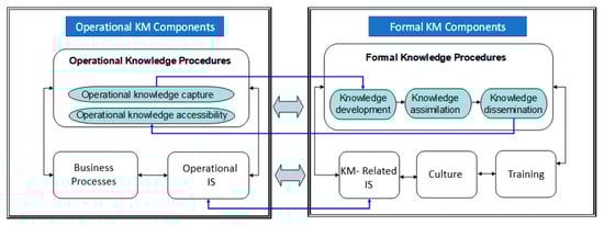 KM is concerned with the process of managing organizations in terms of acquiring, transforming, applying, and preserving knowledge, provided that the appropriate infrastructures are in place to meet organizational goals []. KM infrastructure is necessary to maintain actual and valuable explicit and implicit knowledge in the organizational network. Organizations develop their KM infrastructure to respond quickly to the complexities of a fast-changing environment, which becomes a critical factor that intensifies the organizational competency by shortening the time required to develop competencies []. Infrastructures are challenging to research due to their complexity, and their socio-technical components are often hidden []. KM infrastructure combines social and technical perspectives and includes three main components that KM research in any organization should take into consideration: knowledge processes, organizational culture, and information technology [].