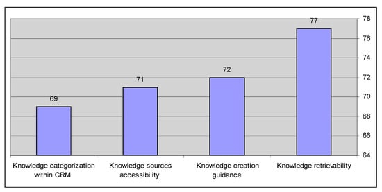 Figure 2 presents the results of the operational knowledge processes survey items. These results indicate that about 69% of the respondents believe that facilitating knowledge indexing within the CRM system, knowledge source accessibility within the work environment, knowledge creation guidance, and knowledge retrieval would significantly improve their work quality.