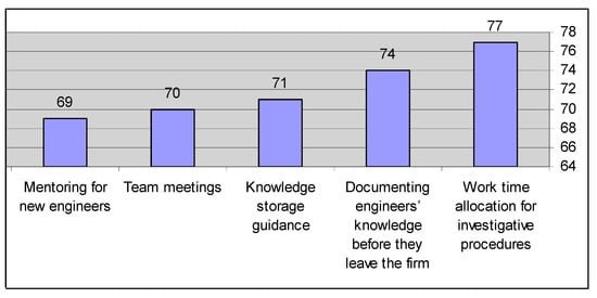 Figure 3 presents the results of the formal knowledge processes survey items. More than 69% of the respondents believe that the formal knowledge processes presented in the graph significantly enhance work quality.
