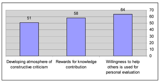 Culture has become increasingly important for organizations in the past 20 years. Studies in KM underscore the inseparable relationship between effective KM and organizational culture [] and address the great value of the implicit relations between organizational culture and performance []. The motivation of knowledge workers to share knowledge is the main issue of corporate culture []. While organizational cultures supporting knowledge sharing offer essential, competitive advantages, different cultural backgrounds of team members, such as different ethnicities, national cultures, gender, or roles, create a context of cultural complexity and might impede knowledge sharing []. Organizations should adopt an entrepreneurial culture when establishing KM activities []. KM-related organizational culture should support workers’ readiness to provide complete, undistorted, and verifiable information, their ability to convey and interpret data without being swayed by elements unrelated to the topic at hand, such as position and status, and their acceptance of responsibility for their actions and their consequences and for learning from such consequences. KM-related culture should encourage workers’ aspiration for team success and enhance trust among people. It should also encourage workers’ beliefs on how personal success is influenced by sharing personal knowledge and experiences and on how sharing personal knowledge may provide the power to influence organizational decisions [].