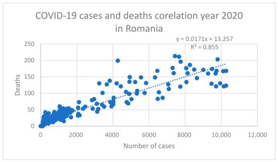 Correlation between the number of cases of COVID-19 and mortality in Romania between 04.03–14.12.2020 (until the appearance of the vaccine). Source: Authors’ development.