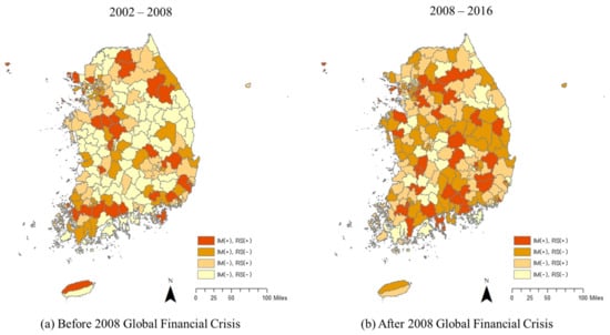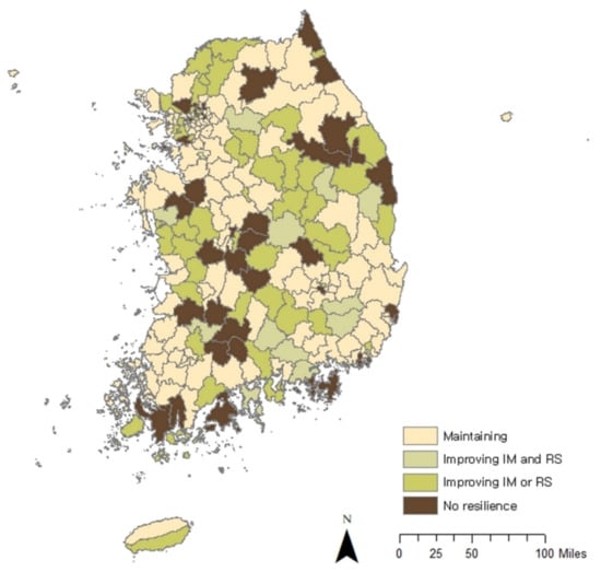 Table 2 provides an overview of the post-crisis economic performance status of the 229 si-gun-gu units across the country in four categories: maintenance, improvement in IM or RS, improvement in IM and RS, and no resilience. It is worth noting that the regional economic resilience of the economic regions exhibits a certain pattern; an economic region refers to a functional region building a network of collaborations in industrial development and R&D investment going beyond the administrative boundaries of provinces and metropolitan areas [24]. In the capital economic region, Gyeonggido (n = 13) achieved more industrial structural improvement than Seoul (n = 3) and Incheon Metropolitan City (n = 1). In the Chungcheng economic region, Chungcheongbukdo (n = 5) and Chungcheongnamdo (n = 5) achieved more industrial structural improvement than Daejeon Metropolitan City (n = 1). Likewise, the Honam, Daegyeong, and Dongnam economic regions showed the same pattern of peripheral areas outperforming metropolitan areas in industrial restructuring and structural improvement.