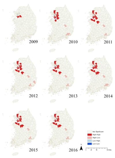 Local indicators of spatial association were applied to the engineering resilience values obtained to identify the existing clusters. Figure 3 illustrates the results. The HH (high-high) clusters of employment resilience in 2009 were Guro-gu (Seoul), Osan, Yongin, and Hwaseong, with a high spatial concentration around the capital economic region. From 2010, these HH clusters were extended to Mapo-gu, Gangseo-gu, Geumcheon-gu, Yeongdeungpo-gu, Seocho-gu, and Gangnam-gu in Seoul, Seongnam, Ansan, Goyang, Namyangju, Osan, Yongin, Paju, Hwaseong, and Gwangju in Gyeonggido. A few cities of the Chungcheong economic area, including Cheongju, Asan, and Dangjin, were also classified as HH clusters. This development indicates that the pattern of HH clusters was concentrated in the capital economic region in the wake of the 2008 financial crisis, extending to other districts and cities in and around this area with an increasing tendency over time, reaching out to some adjacent cities in the Chungcheong economic area.