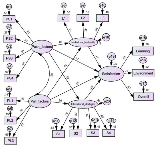 We carried out a reliability analysis, factor analysis, and SEM. Reliability was used to estimate the internal consistency of the instrument; a Cronbach’s alpha >0.6 can be used as an index of convergent validity [53]. Concerning the factor analysis, we set the criteria for the candidate indicators, and factor loadings of less than 0.50 were omitted [54,55]. The indicators of the push–pull factors and of the institutional situation were justified by the reliability analysis and factor analysis. SEM is a flexible and powerful means of assessing the relationships among latent constructs [56]. IBM SPSS 26 and AMOS 26 (Analysis of Moment Structure) were used to conduct SEM analysis. We assessed the structural relationships among the push factors, pull factors, institutional leadership, international strategies, and satisfaction. The overall model fit in SEM was assessed using the common goodness-of-fit indices, including Chi-square minimum (CMIN), the ratio of Chi-square to degrees of freedom (χ2/df < 3.0), number of distinct parameters (NPAR), the goodness of fit index (GFI > 0.90), adjusted goodness of fit index (AGFI > 0.90), Parsimonious goodness of fit index (PGFI > 0.50), root-mean-square residual (RMR tends to be relatively smaller), and Akaike Information Criterion (AIC = χ2 – 2 × df) [57,58]. Regarding the ratio of Chi-square to degrees of freedom, Wheaton and colleagues suggested 5 or less. Some have suggested as low as “2” or as high as “5” [59], while Byrne et al. indicated that χ2 /df > 2 is a bad fit [60]. If the calculated value in the SEM model reaches the ideal criteria, it shows acceptable goodness-of-fit between the hypothetical model and sample data, and the hypothetical model is supported.