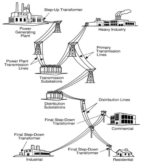 Energy needs are typically managed through energy generated in generating plants. Figure 1 depicts a typical electric power system with generating plants, a transmission system, and distribution networks that are connected with each other. The power produced depends upon the capacity of generation. This ability ranges from megawatts to gigawatts [1]. These huge levels of power-generating stations are situated far away from load points. The transmission system and distribution system supply electrical power from power-generating plants to different load centers [2,3].
