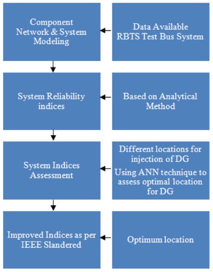 This paper demonstrates the impact of DG on reliability, and an ANN approach was applied to find the optimal location of the DG. The Electrical Transient and Analysis Program (ETAP) tool was used to validate the results. For modeling of the network and system, reliability data that were available in RBTS were utilized. Based on the analytical method, the reliability indices were calculated. After injecting the DG at different locations, the reliability indices were evaluated in terms of their enhancement. The complete framework of this work is shown in Figure 2. This paper has seven sections; Section 1 gives a brief introduction to this work. Section 2 presents the literature about reliability. Section 3 gives a brief introduction of DG and its impacts. Section 4 presents a critical review of related work and describes how the problem was formulated. Section 5 presents the mathematical modeling. Section 6 provides a description of the simulations. Section 7 and Section 8 present discussions on the results and conclusions, respectively.