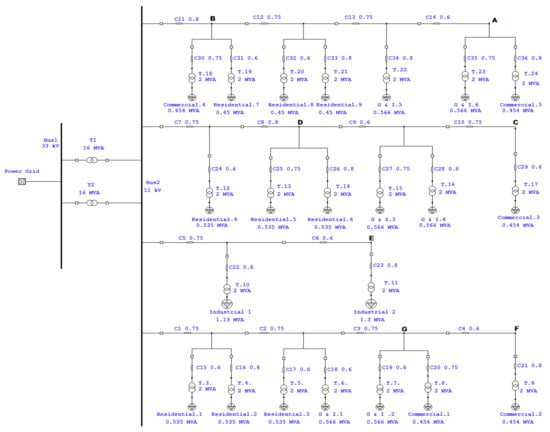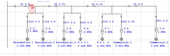 The ETAP tool was selected for the modeling of the test cases in order to validate the results. ETAP is a powerful electric power simulation tool with the help of which many analyses related to power systems can be performed. The reliability analysis with the help of ETAP used an analytical approach to evaluate the distribution system reliability. RBTS bus 2 [25] was modeled in ETAP, as shown in Figure 9. The active and passive failure rates of the components, load-point capacity, and cable lengths were taken as per RBTS.
