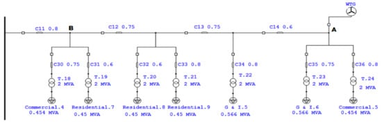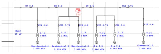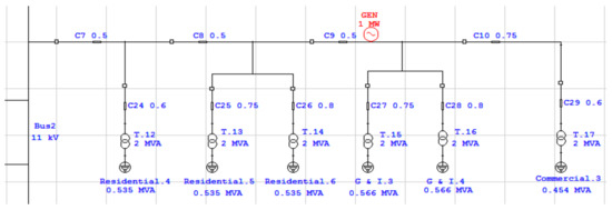 The DG was placed 1400 m from load point 14, as shown in Figure 14. Figure 17 shows the injection of the DG at the optimal location predicted by the ANN. The results in Table 6 show that the indices had the greatest decrease as compared to the previous positions. From the indices recorded here, it can be concluded that point 14, which was predicted by the ANN as the best location for the DG, was validated, as the system indices were further decreased and the reliability was enhanced.