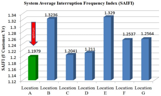 The graphical representation in Figure 11 shows the comparison of the SAIFI index at different locations, from which it is clear that location A is the best location for injecting DG.