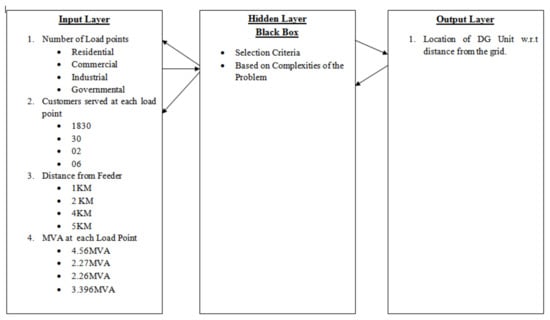 The main interest in using an ANN in this research was to model the most suitable algorithm for finding the best possible location for DG in a distribution network, which can lead to the improvement of the reliability of the distribution network in terms of SAIDI, SAIFI, and EENS. In implementing the ANN-based model, the intention was to evaluate the predictive capabilities of the proposed ANN in such a way that it stood a reasonable chance of performing well in terms of selecting the right location for the DG in the given distribution network, to establish its effectiveness, and to validate its implementation. Figure 12 shows the layers and how these layers were modeled.