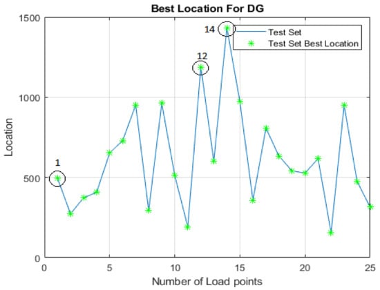After the ANN was trained with the RBTS training dataset, random tests of 25 datasets or load-point data were used to find the best possible location of the DG for installation at that particular node point. Figure 14 shows the plotting of the testing dataset, in which three points were selected for validation. After placing the DG at these localities, reliability tests were performed in ETAP, and the system indices were recorded.