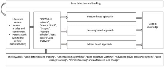 Literature was gathered from the electronic database. The database included “ISI Web of Science”, “Science Direct” “Scopus” “Google Scholar” and “IEEE Xplore”. The keywords used for the search were “Lane detection algorithms”, “Lane tracking algorithms”, “Lane departure warning algorithms”, “Advanced driver assistance system”, “Lane change tracking”, “Vehicle tracking”, Vehicle tracking sensors”, and “Automated lane change” or a combination of these words (Figure 1). We also searched for patented works. Patents published from 2006 to 2020 were also searched using the term “Lane detection and tracking,” “Lane departure warning,” and “Advance driver assistance system” using the “Google scholar” and “PubMed”. As mentioned in Section 1.1, the objective of patents search is to acknowledge growing commercialisation interests in this field of study rather than a detailed review of the patented works. As such, only a sample of patents works from vehicle manufacturers was discussed. The period studied for the literature is the past two decades, as lane tracking and detection is an emerging field that has gained momentum post-2000. English language-based publications were only considered for the review as they are widely accessible to global readers. Relevant publications further improved the search procedure in the reference lists available in the collected literature. The lane detection and tracking algorithms were investigated under three approaches that have been commonly referred to in the literature (Features based, learning-based and model-based as shown in Figure 1). The existing databases were analyzed to identify the availability of datasets for future research. The lane detection criteria, calculation of the detection rate and accuracy of the algorithms that have been adopted in the literature are also reviewed.
