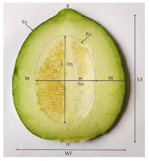 Illustration of biometric parameters on longitudinal section of Barattiere fruit: A, apex or pistillar extremity or blossom end; B, base or peduncular extremity or stem end; Ex, exocarp or skin; En, endocarp or placenta; f, fruit; LEn, length of endocarp; Lf, length of fruit; M, mesocarp or flesh; WEn, width of endocarp; Wf, width of fruit.