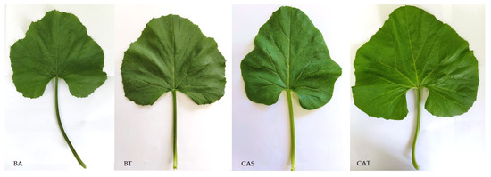 Fully expanded leaves of unripe melon genotypes (from left to right: Barattiere ‘Allungato’ (BA), Barattiere ‘Tondo’ (BT), Carosello ‘Scopatizzo’ (CAS), Carosello ‘Tomentoso’ (CAT) collected at 50% flowering. BA and BT: leaf from vertically trained primary stem; CAS and CAT; leaf from the vertically trained principal stem. Leaves in different scales).