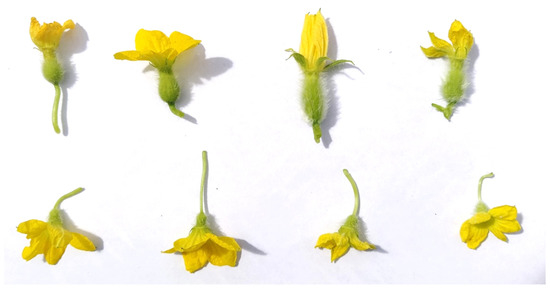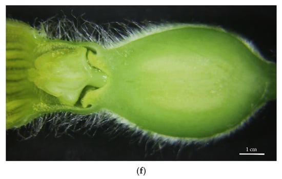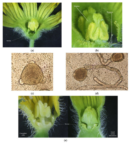 Both types of flowers had a floral nectary, and the androecium consisted of five connate stamens producing viable pollen (Figure 6a–d). The style and stigma of the landraces had similar characteristics. Compared to the cucumber female flower, the style of local melons was shorter and the stigma was usually smaller; both were greenish and the nectary was yellowish instead of white to pale yellow (Figure 6e). The full pistil and the abovementioned related features are represented in Figure 6f.