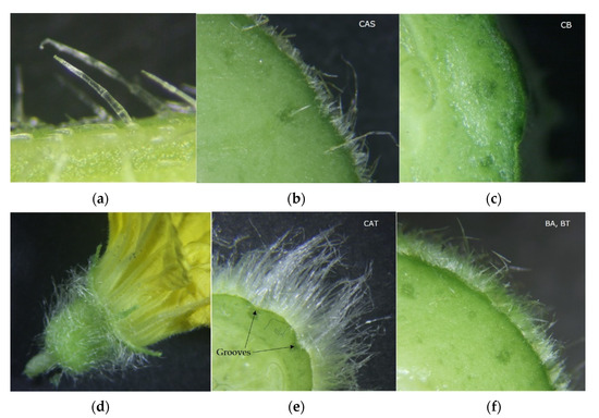 Details of pubescence: (a) Trichomes of leaf vein of Carosello ‘Scopatizzo’ (CAS); (b) cross-section of young fruit of CAS; (c) cross-section of young fruit of cucumber ‘Baby star’ (CB); (d) Pubescence of floral parts of staminate flower of CAS; (e) cross-section of young fruit of Carosello ‘Tomentoso’ (CAT), arrows point grooves; (f) cross-section of young fruit of Barattiere ‘Allungato’ and ’Tondo’ (BA and BT).