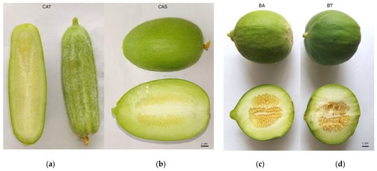 External view and longitudinal section of harvested fruits of unripe melon landraces: (a) Carosello ‘Tomentoso’ (CAT); (b) Carosello ‘Scopatizzo’ (CAS); (c) Barattiere ‘Allungato’ (BA); (d) Barattiere ‘Tondo’ (BT).