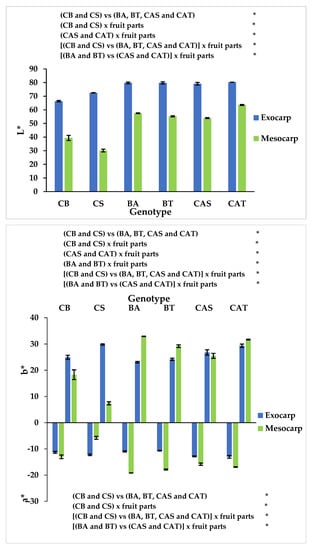 Overall, the fruit parts’ mesocarp (inner layer) and exocarp (external layer) differed in colour parameters, except C (Figure 8 and Figure 9). Some interactions between genotype groups and fruit parts gave significantly different results (Figure 9). Significative contrasts for all parameters were measured for the interaction between two cucumbers in relation to their parts and for the interaction between cucumbers and local genotypes in relation to their parts: the cucumbers’ exocarp showed higher values of a* and b* and lower C compared to the mesocarp; an opposite characterization was described in local genotypes fruits, with the exception of b* in CAS. Barattiere and Carosello contrast varied for all parameters except h°. Referring to the interaction within the parts and the genotype, CAS and CAT differed in lightness and b*; BA and BT in h°.