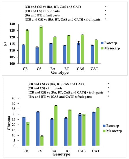 Colour parameters of fruit harvested at commercial maturity referring to cucumber ‘Baby Star’ (CB), cucumber ‘Modan’ (CS), Carosello ‘Scopatizzo’ (CAS), Carosello ‘Tomentoso’ (CAT), Barattiere ‘Allungato’(BA), Barattiere ‘Tondo’(BT) and fruit parts (exocarp and mesocarp). Values are the average of three replicates. Parameters refer to CIELAB colour system: L*, lightness; a*, red(+)/green(−) chromaticity, and b*, yellow(+)/blue(−) chromaticity; h°, hue angle; C, chroma. Text in the chart refers to significant contrasts between genotype groups and interaction between genotype groups and fruit parts; significance of contrasts: * = p ≤ 0.05.
