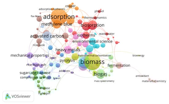 Keyword association map of agricultural wastes from 119 publication obtained from ScienceDirect database.