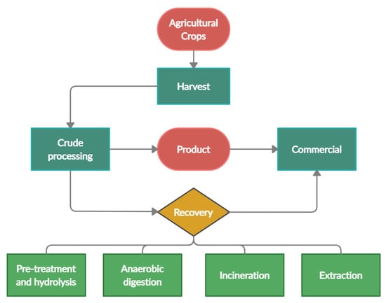 The importance of agricultural waste conversion into valuable by-products is translated into various sectors of the market. A recent study quantified the market of products from agricultural wastes in various sectors; highest at USD 63.3 billion in the beverage industry, followed by USD 48 billion in the medical industry, a total of USD 100 billion in the transportation, construction, medical industry and approximately USD 46 billion in the food and consumer goods sector [8]. Overall, valorisation of agricultural waste can improve the livelihood of the local communities through more income per harvest [6] while reducing excessive expenses for waste disposal and minimizing the carbon footprint in the process of reducing environmental impact [9]. Figure 2 is a simplified diagram of obtaining value-added by-products from the processing of agricultural input.
