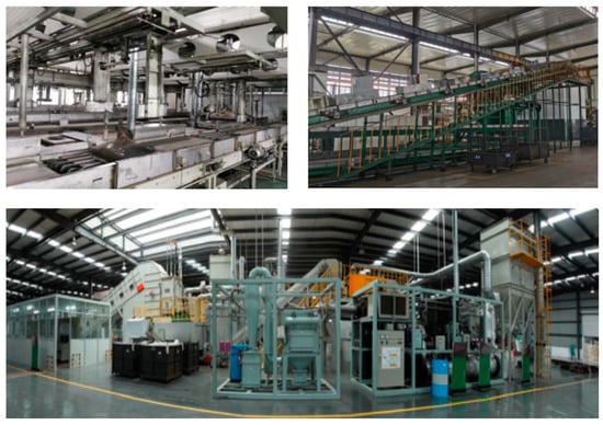 From 2012 to 2019, a total of five batches of 109 authorized WEEE recycling companies were included in the list of WEEE fund subsidies distributed in 29 provincial administrative units, with an annual processing capacity of 163 million units. As shown in Table 1 and Table 2, the amount of WEEE dismantling in China increased significantly. In 2019, 83.56 million WEEE units were recycled and disposed of, including 43.19 million TVs, 10.77 million refrigerators, 15.73 million washing machines, 6.2 million air conditioners and 7.67 million computers. Compared with 2013, the amount of dismantling in 2014 nearly doubled, and the average growth rate from 2014 to 2019 exceeded 13% [29,30]. At the same time, a set of technical routes combining labor and machinery suitable for China was developed, and the dismantling technology, equipment and production lines have been continuously standardized and improved, as shown in Figure 1.